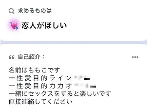 モデルのような写真を使っているユーザーのプロフィールを見ると、性愛目的ですというフレーズと、LINE IDを添えて書いてあることがよくあります。
